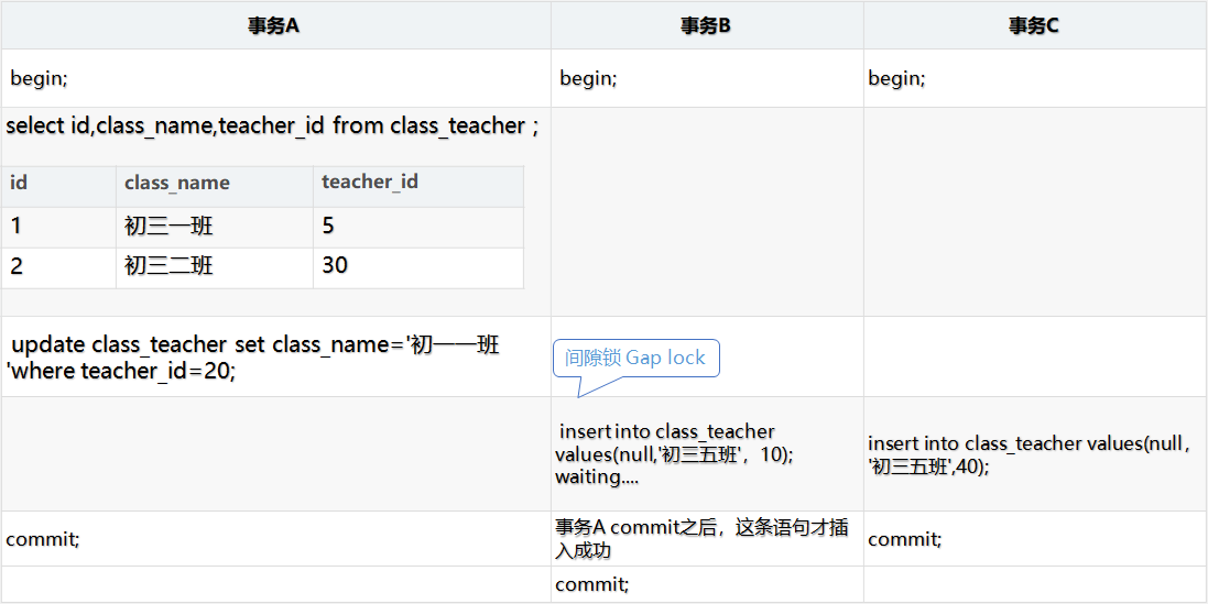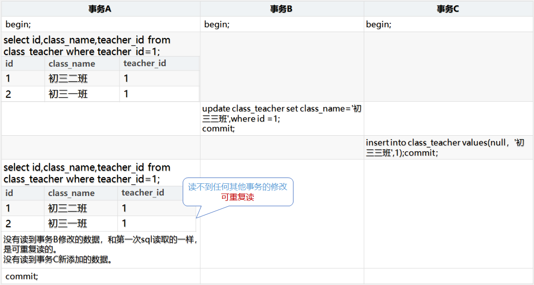 上文讲解了不可重复读的情况,下面我们来看看在RR隔离级别下的情况。当 teacher_id=1时,事务 A 先进行一次读取操作,事务 B 中间修改了 id=1 的数据并提交,事务 C 也插入了一条数据并提交。事务 A 第二次读到的数据和第一次完全相同。所以说它是可重读的。