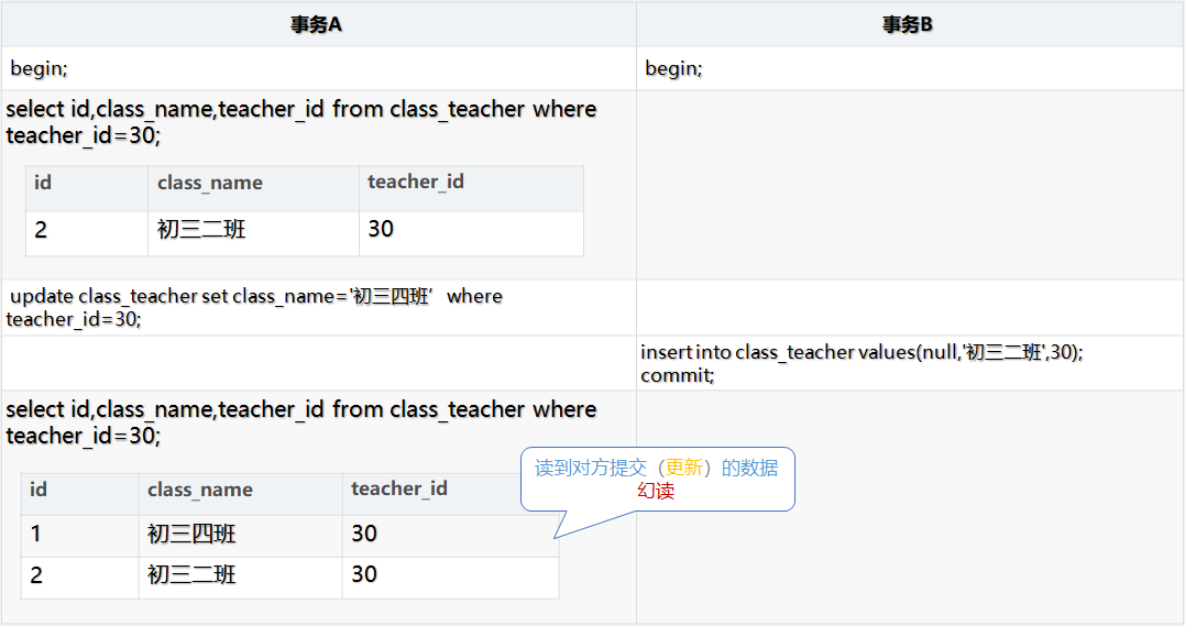 如下图所示,事务 A 修改了所有 teacher_id=30 的数据,但是当事务 B INSERT 新数据后,事务 A 发现莫名其妙的多了一行 teacher_id=30 的数据, 而且没有被之前的 UPDATE语句所修改,这就是“当前读”的幻读问题。