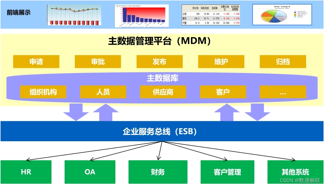 3.MDM+ESB主数据治理方案:以MDM为核心实现基础数据的全生命周期管理,将各个业务中的基础数据同步到MDM平台,并完成相关的数据清洗、统一、编码等,再将治理后的数据分发到下游系统,从而实现各个系统基础数据的同源、统一、准确,为后续深度的业务集成、数据分析、数据挖掘奠定基础。