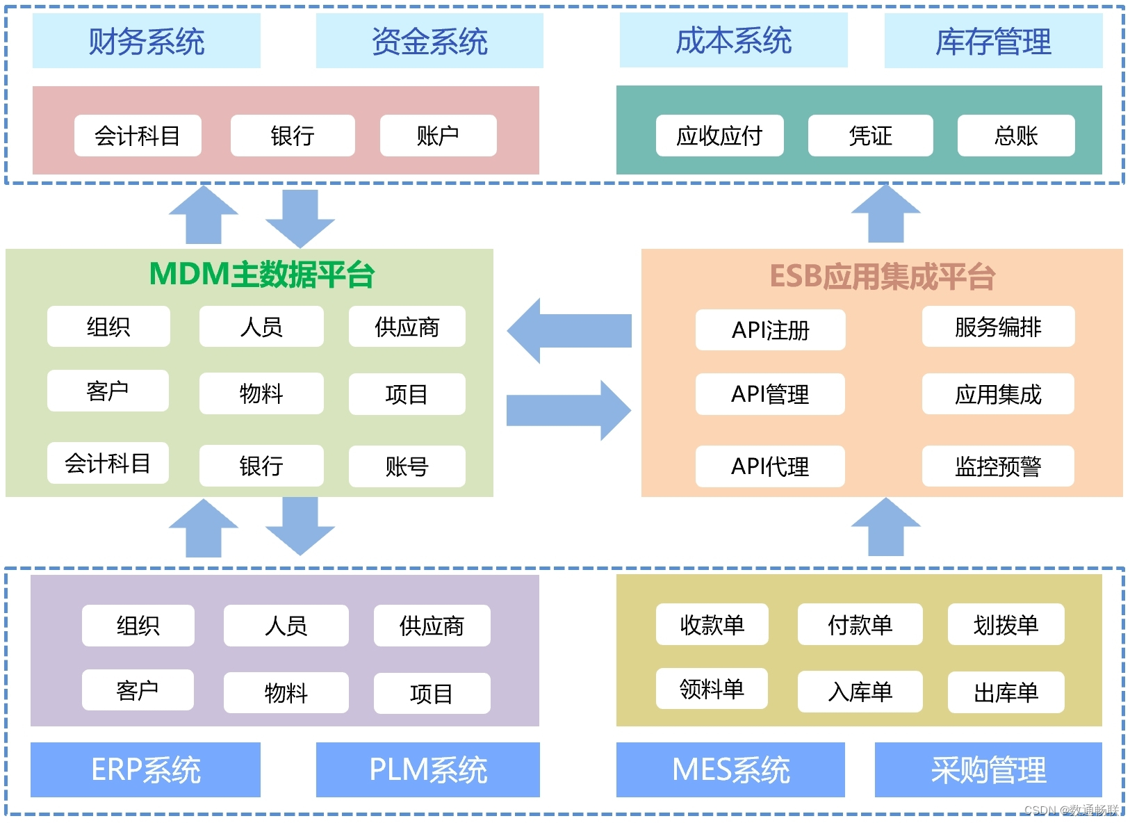 1.ESB+MDM统一集成平台方案:主要目的是通过集成底座平台打通系统间业务单据集成的难题,主要面向各个系统的业务数据,如财务单据、财务凭证、收款单/付款单、入库/出库单等。由业务系统提供标准化的业务单据接口,ESB将接口注册到平台,构建API注册中心,实现对API的管理、监控、测试、预警等,同时通过应用集成进行服务接口编排,实现系统单据的集成。
