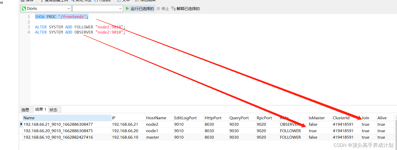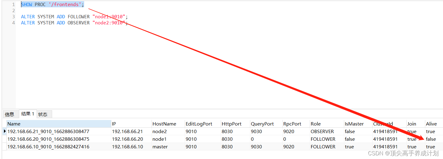 分别启动(node1,node2)FE,第一次启动需要添加--helper,后面启动就不用了