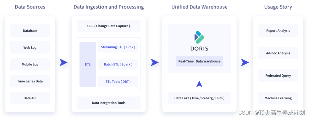 统一数仓构建 :一个平台满足统一的数据仓库建设需求,简化繁琐的大数据软件栈。海底捞基于 Doris 构建的统一数仓,替换了原来由 Spark、Hive、Kudu、Hbase、Phoenix 组成的旧架构,架构大大简化。