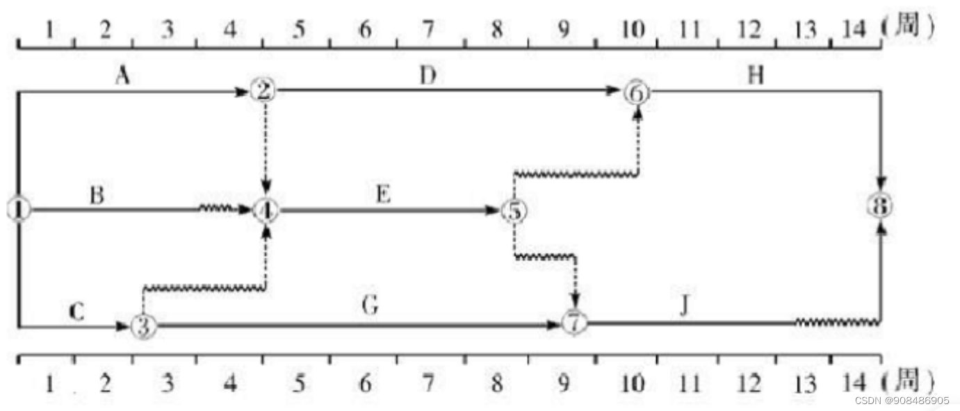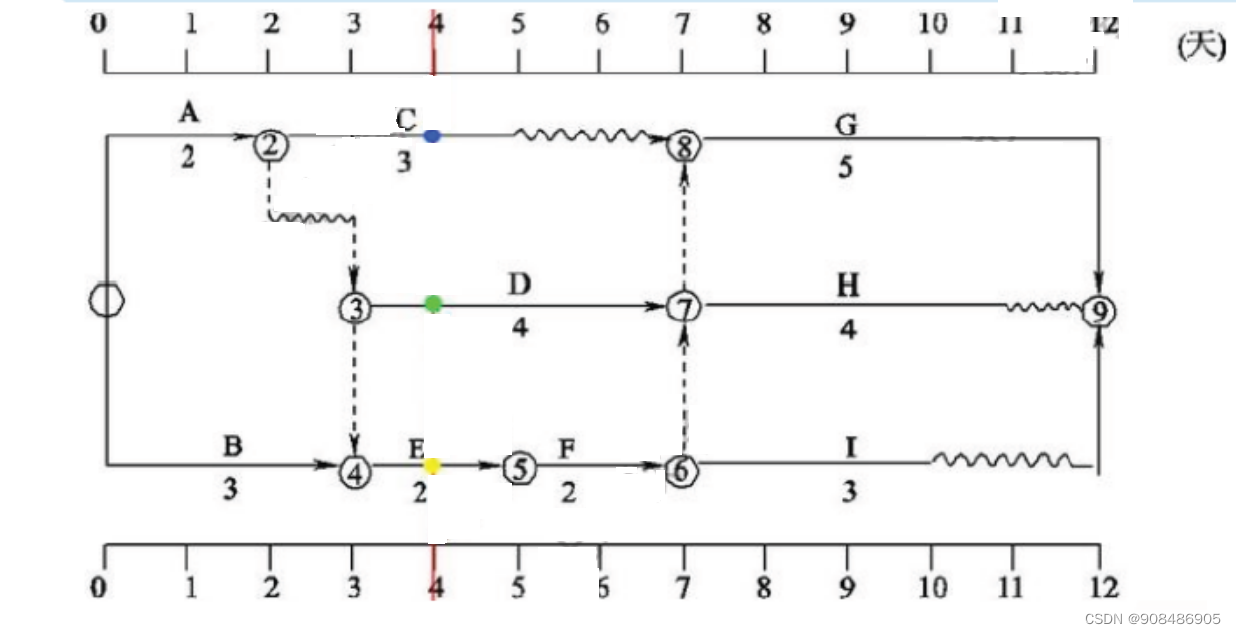| 前锋线时标网络图: | 基于时标网络图,从检查时刻的时标点出发,用点划线依次将各项工作实际进展位置点连接而成的折线。通过实际进度前锋线与原进度计划中各工作箭线交点的位置来判断工作实际进度与计划进度的偏差。