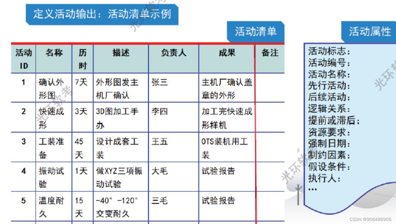 | 进度管理计划,范围基准(WBS、WBS字典,范围说明书) 组织/事业 | 活动清单;活动属性;里程碑清单。 活动编码、活动描述、紧前活动、紧后活动、逻辑关系、提前量与