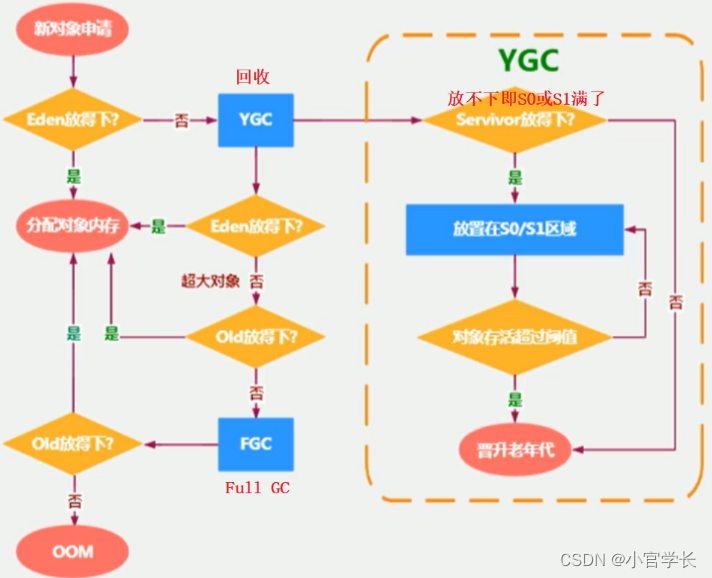 老年代放置长生命周期的对象,通常都是从survivor区域筛选拷贝过来的Java对象。当然,也有特殊情况,我们知道普通的对象会被分配在TLAB上(这也是堆内存);如果对象较大,JVM会试图直接分配在Eden其他位置上;如果对象太大,完全无法在新生代找到足够长的连续空闲空间,JVM就会直接分配到老年代。