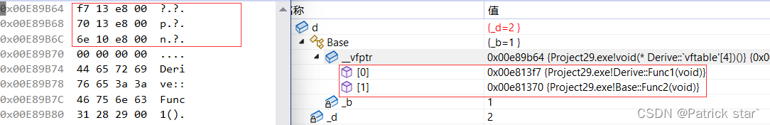 2. 基类b对象和派生类d对象虚表是不一样的,这里我们发现Func1完成了重写,所以d的虚表中存的是重写的Derive::Func1,所以虚函数的重写也叫作覆盖,覆盖就是指虚表中虚函数的覆盖。重写是语法的叫法,覆盖是原理层的叫法。