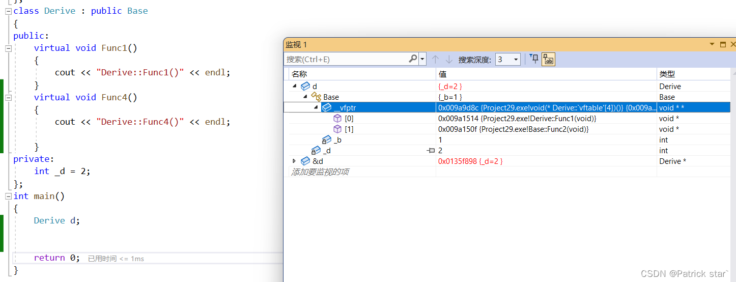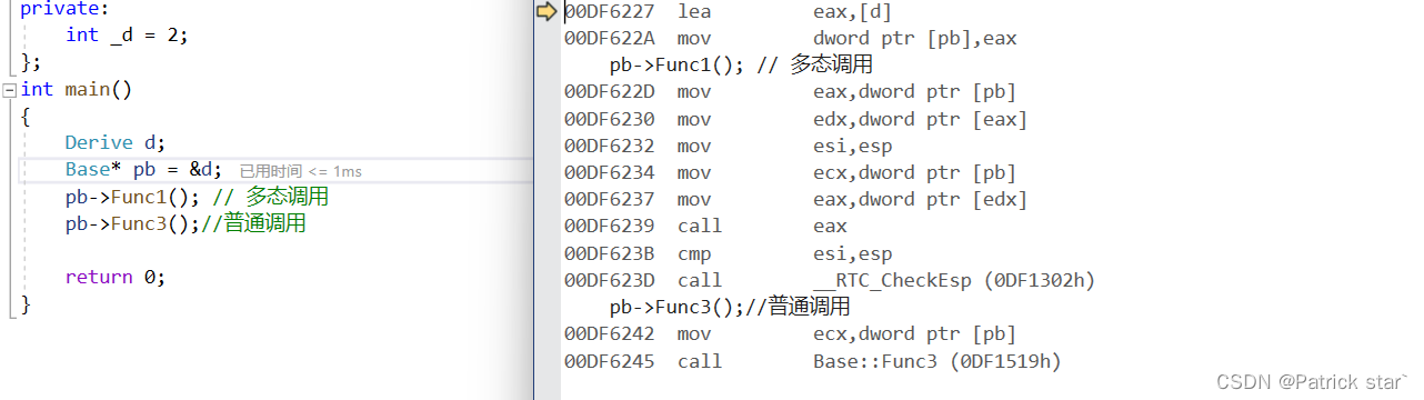 对上面代码进行一个改造,增加了一个子类Derive,在子类中重写了Func1,在Base类中增加了虚函数Func2、和普通函数Func3。