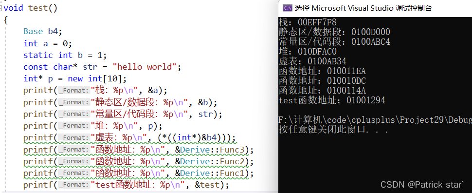 虚表和常量区挨得近,并且虚函数地址和test()地址的挨得近的,所以虚表中存的是虚函数的地址,而虚函数和其他函数存在一起