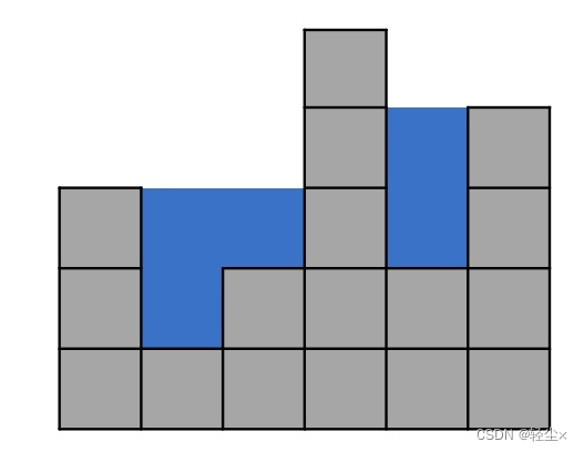 说明:数组 [3,1,2,5,2,4] 表示柱子高度,在这种情况下,可以接 5个单位的雨水,蓝色的为雨水