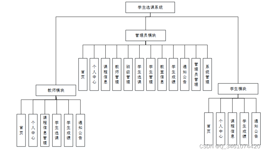 本学生选课系统主要包括三大功能模块,即学生功能模块、管理员功能模块和教师模块。