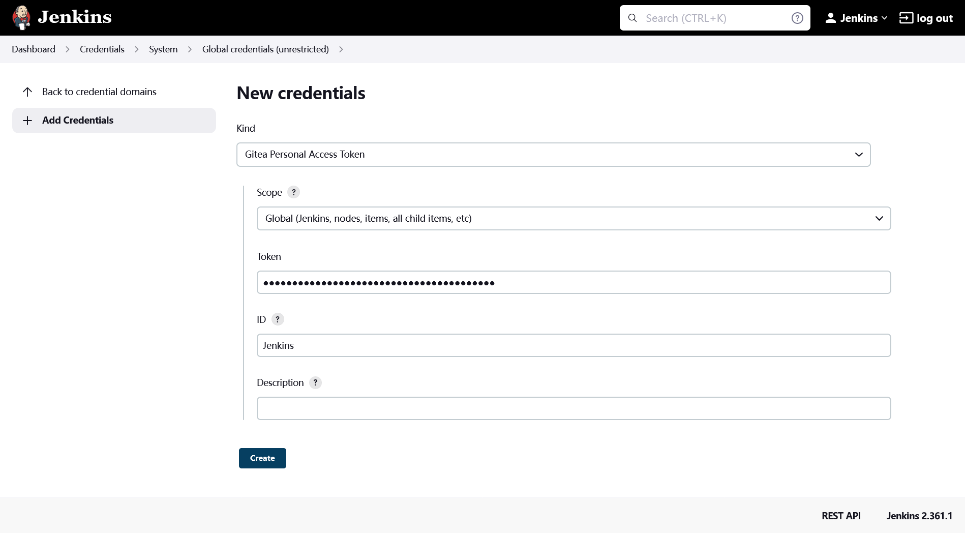 - 打开 Manage Credentials 添加 Gitea 访问令牌,用于从 Gitea 拉取代码、通过 API 安装 Webhook