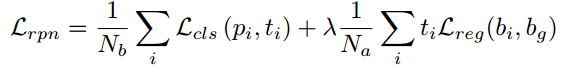 其中Lcls是两个类(目标或非目标).bi和bg分别表示第i个anchor的预测框和对应ground-truth目标框。与任何高于给定阈值的ground-truth重叠的anchor被认为是正样本(ti=1),其余的anchor被认为是负的(ti=0)。因此,乘法项确保回归损失仅对正anchor激活。Na和Nb表示anchor位置的数量和batch大小,λ是平衡权重。与FastR-CNN类似,执行ROI pooling并将这些区域发送到两个分支进行分类和回归,目标函数如下: