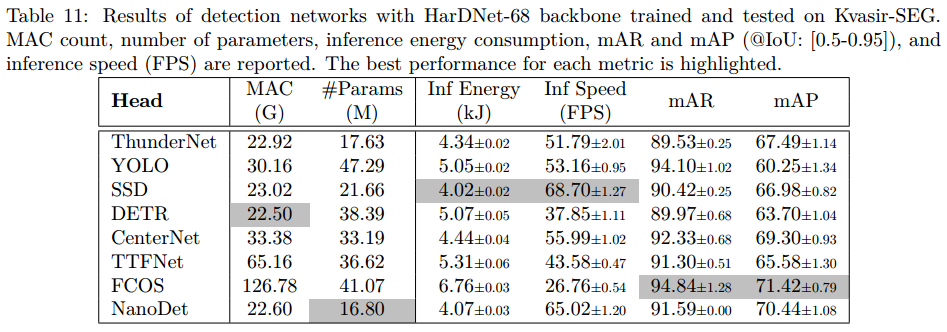 作者计算检测器的卷积层、BN层和全连接层的MAC(乘法累加操作)计数,并得到可学习参数的数量(以百万为单位)。作者还得到了每个主干和检测头组合的每秒帧数(FPS)的推理速度。推理速度是针对500张图像计算得到的,并取平均值以消除偏差。最后,考虑到最近的节能AI趋势(Schwartz等人)al.,2019),作者在整个测试数据集上计算模型的推理能耗。作者使用NVIDIA Management Library(NVDIA,2019)来计算GPU在推理过程中的近似功耗。数据集的推理能耗以千焦(KJ)为单位显示,不包括其他组件的功耗。