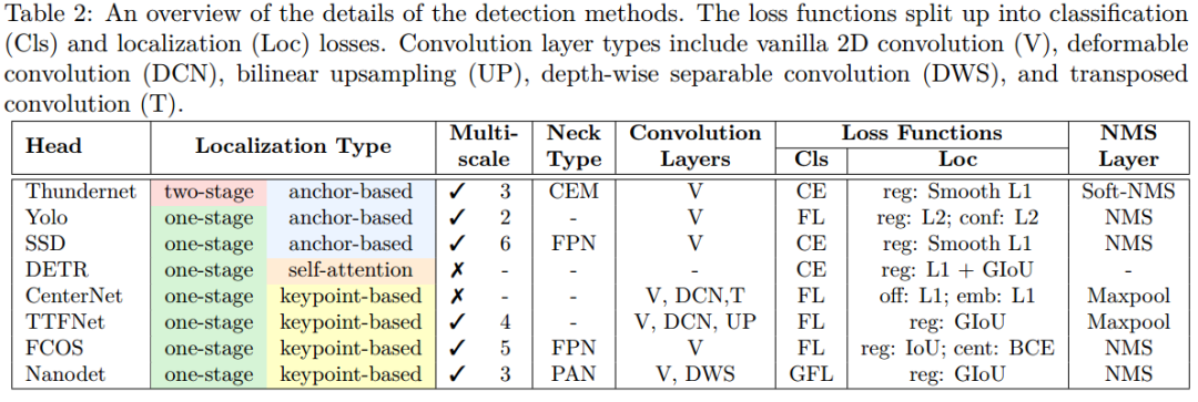 由于作者的研究范围是实时目标检测,作者专注于一个两阶段检测器:ThunderNet(Qinetal.,2019),两个anchor-based的检测器:SSD(Liuetal.,2016),YOLO(Redmon&Farhadi,2017),四个(anchor-free)基于关键点的检测器:CenterNet(Zhou等人,2019a)、FCOS(Tian等人,2019)、NanoDet(Lyu,2020)和TTFNet(Liu等人,2020),和一个基于Transformer的检测器:DETR(Carionetal.,2020)