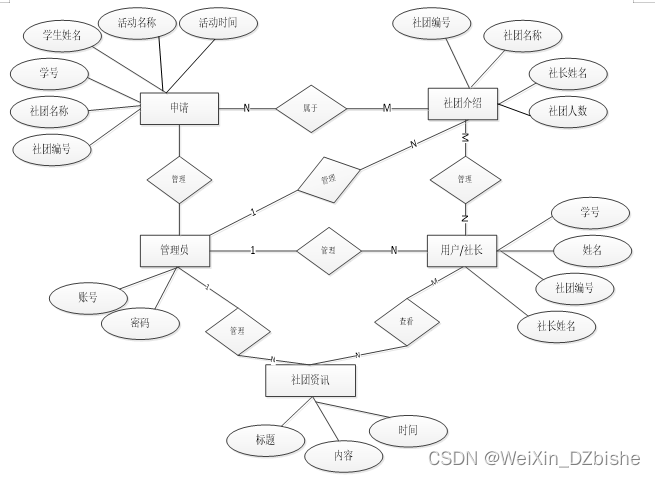 下面是整个高校社团管理系统中主要的数据库表总E-R实体关系图。