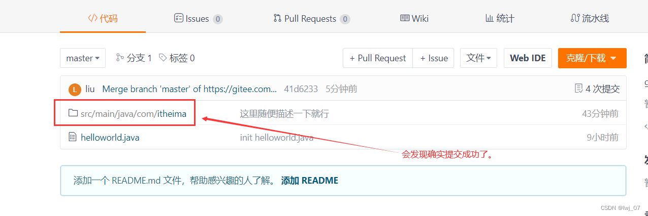 最后我们再在idea上push就能成功了,就能把本地仓库的数据推送到远程仓库当中了,并且我们远程仓库中确实有了本地仓库推送的数据了。