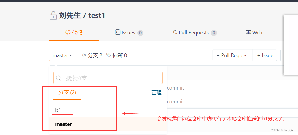 因此我们也可以在本地仓库的b1分支下写一些代码,然后通过提交到本地仓库中然后推送到远程仓库的指定分支中,那么远程仓库的那个分支中就有了我们本地仓库b1分支下写的这些代码了: