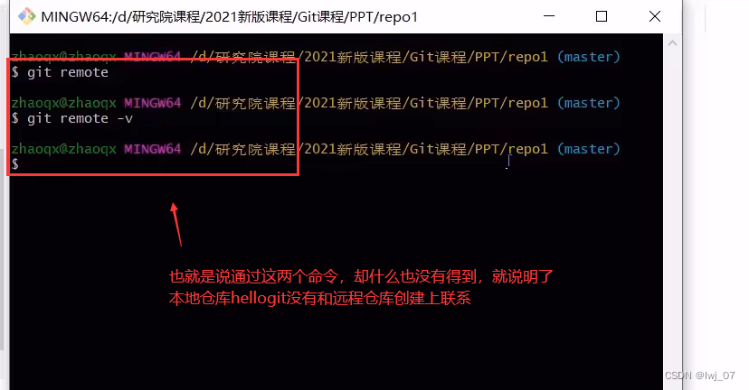 注意:只要是要向远程仓库进行一些操作的时候,先通过命令看一下本地仓库是否和远程仓库建立关系了,然后再进行一些操作。