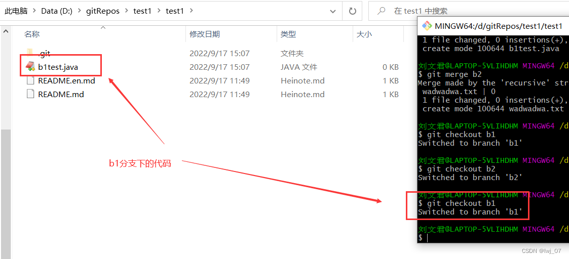 然后通过命令把b1分支合并到master分支即可(那么b1分支下的代码就在master分支下了):