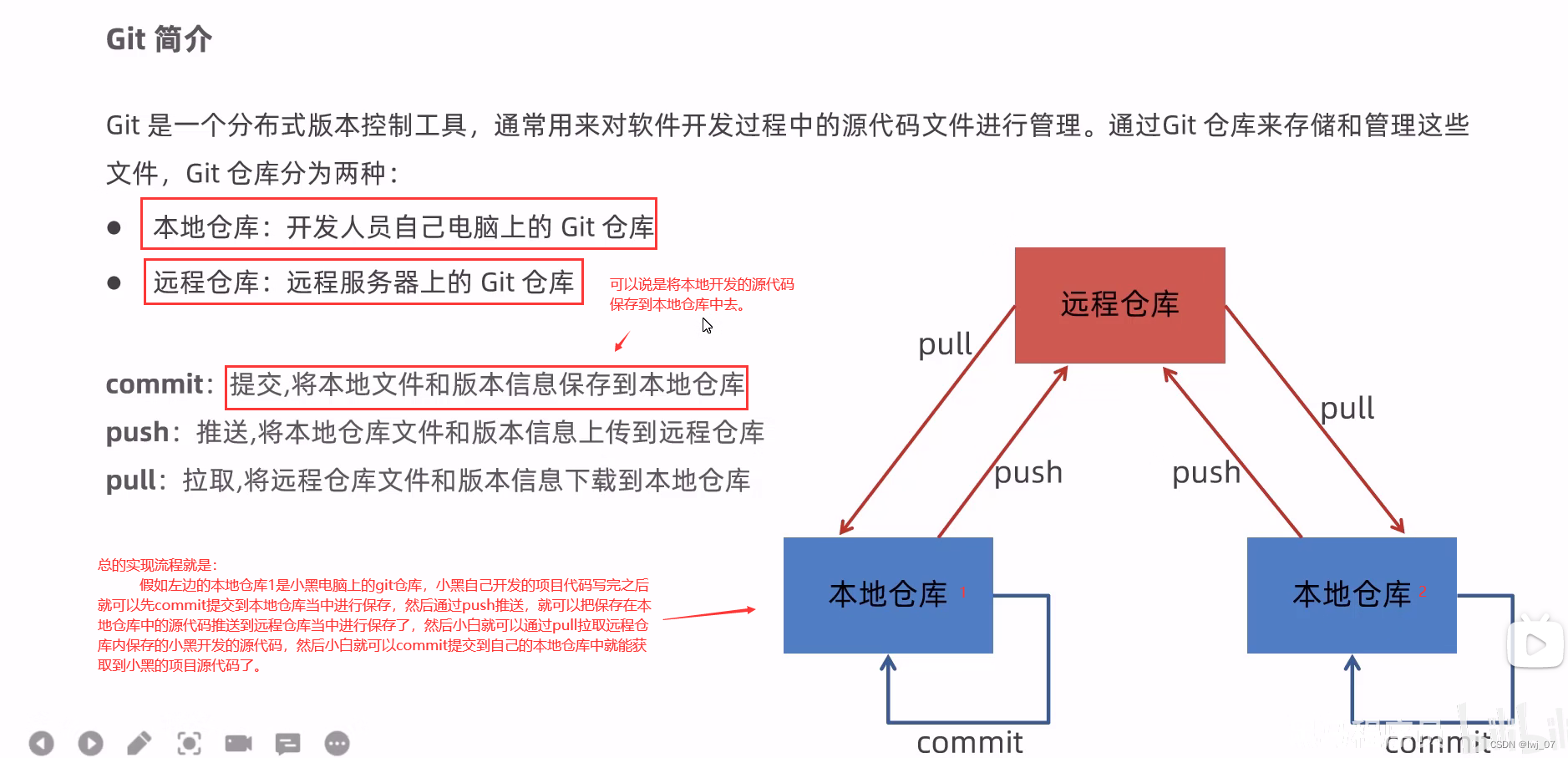 小白的步骤就是:把修改的代码先保存到暂存区、然后提交到版本库(本地仓库),然后把本地仓库中的代码推送到远程仓库中,最后小黑就可以再拉取远程仓库中的数据(也就是小白推送的数据)到自己的本地仓库中了。这里不再演示命令操作。