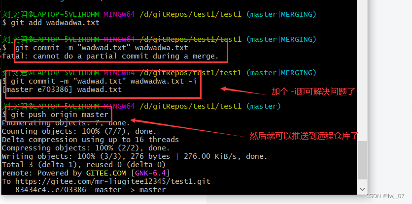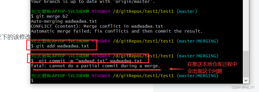 然后我们手动处理好之后,就可以把master分支下的该修改好的代码在本地仓库推送到远程仓库当中去了:(推送过程中会出现下面的问题)、