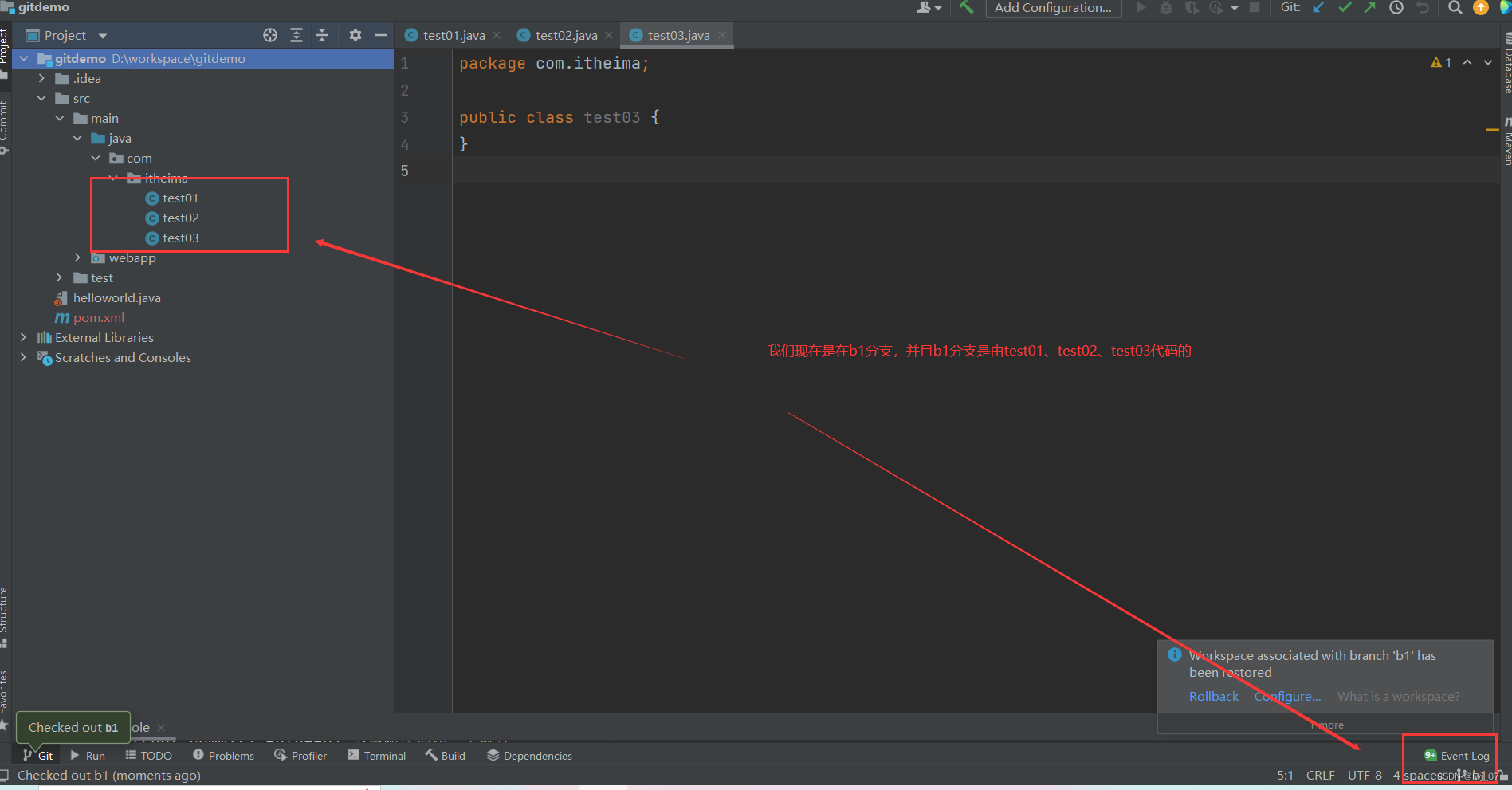 我们现在就是把b1分支合并到master分支下,也就是说把b1分支下的代码合并到master分支下: