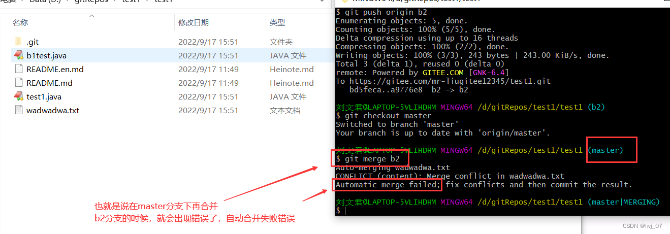 也就是说,我们上面已经知道 master分支下已经合并了b1分支和b2分支的代码了(b1分支下的代码:b1test.java,b2分支下的代码:wadwadwa.txt),合并完之后我们知道,在master分支下也有了b1分支下的代码和b2分支下的代码了,如果我们同时在master分支下和b1分支或者b2分支下修改代码的话,那么就会产生分支合并冲突问题(也就是说,我们知道master分支合并到了b1分支下的test1.java代码了,如果我们同时在master分支下和b1分支下修改此test1.java代码,然后又把该在b1分支下的这个修改的代码合并到master分支下那么就会发生冲突问题)