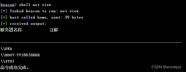cs上线之后,可以先用 net config Workstation 查看当前用户域信息 。可以用 net view /domain 来查看一下有多少个域,因为一个环境可能存在多个域。 如已确认域控主机,可以再进一步收集局域网内其他主机信息 net view收集其他主机ip 。