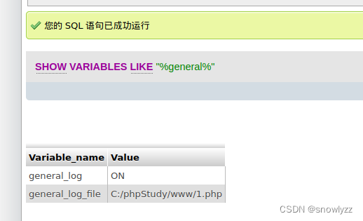 - set global general_log_file=‘C:/phpStudy/www/1.php’,指定日志写入到网站根目录的 1.php 文件.