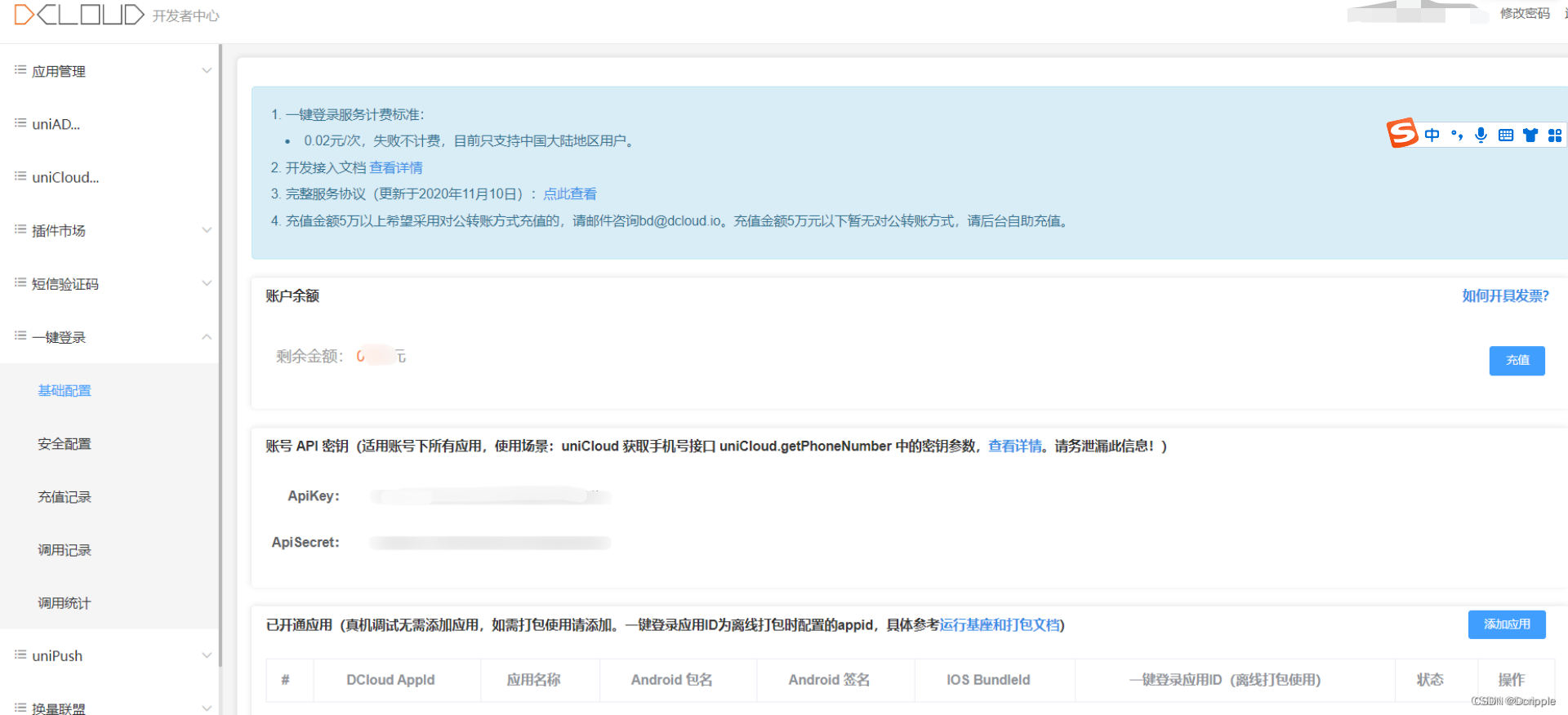 开通一键登录服务, 获取关键最关键的两个参数 ApiKey 和 ApiSecret
