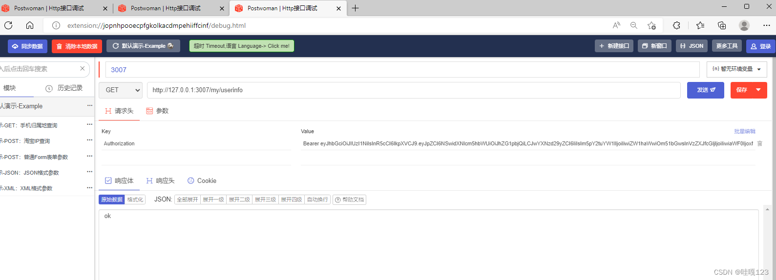 使用前面登录模块的生成的token,在请求头中进行访问需要权限的my接口