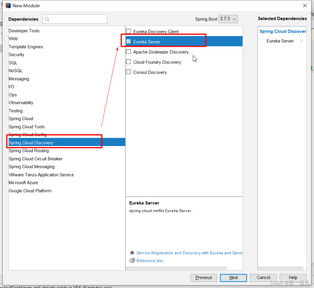 2.在eureka的model中,创建springboot的model,选择添加eureka-server依赖。