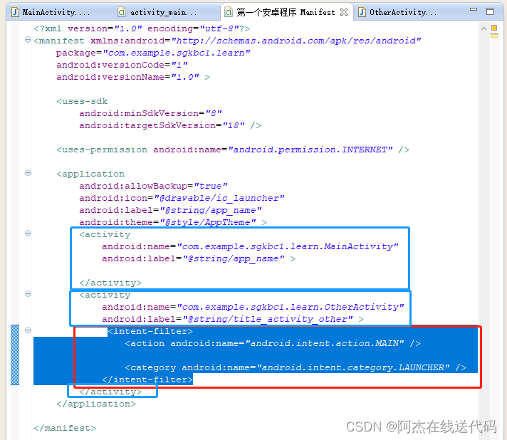 这个时候有两个页面,运行时启动哪个页面取决于AndroidMainifirst中红色框的这块代码块位于哪位activity中(蓝色框之中)