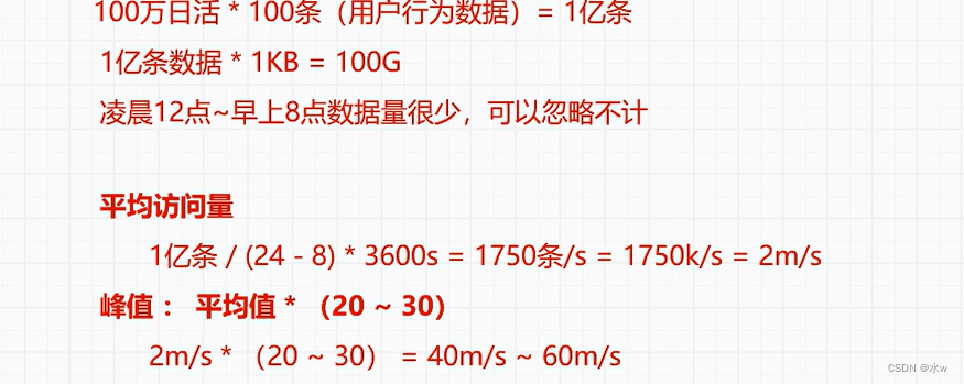 假如100万的每天活动用户,会产生100万x100万条=1亿条的用户行为数据,每条数据1kb,那么大概有100G的数据量。