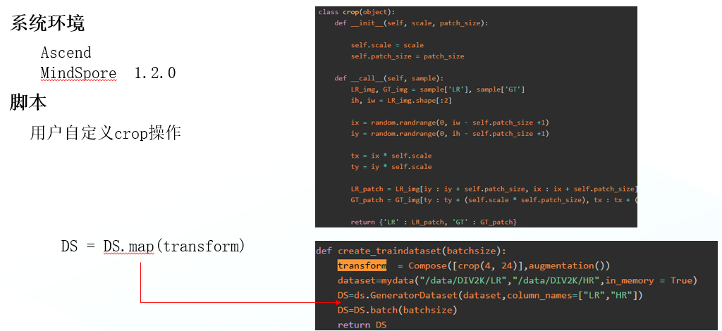 GeneratorDataset中存在两个数据列”LR”, “HR”,但是Crop类的__call__函数中除self外只有r入参sample,导致传入的数据类型转为tuple,与期望的numpy.ndarray不符合。