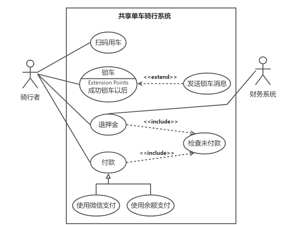 根据日常的使用场景并结合作为示例的素材考虑,骑行者比较普遍的目标一般包含:扫码用车、锁车、付款、退押金。另外需要强调的是,系统能够为参与者实现目标是系统的基本原则,参与者的目标也不能天马行空,参与者的目标应当是系统力所能及的,在系统边界内的。接下来,我们将以上提到的骑行者的目标作为用例,并将其补充到当前示例的用例图中。用例对应的符合是椭圆形,并且用例需要包含在系统边界的矩形之中。