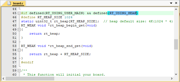系统内存堆的初始化在 board.c 中的 rt_hw_board_init() 函数中完成,内存堆功能是否使用取决于宏 RT_USING_HEAP 是否开启,RT-Thread Nano 默认不开启内存堆功能,这样可以保持一个较小的体积,不用为内存堆开辟空间。
