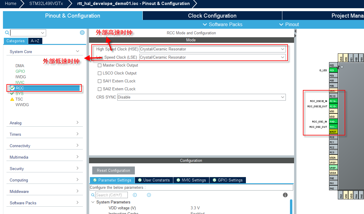 时钟配置,创建好工程后,可以采用默认的时钟配置,也可以自定义时钟,小飞哥采用的是外部时钟配置,首先需要选择时钟源
