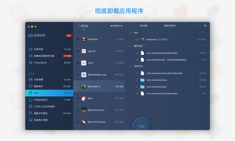 移除整个应用程序,包括其所有关联文件和缓存文件以及剩余碎片。