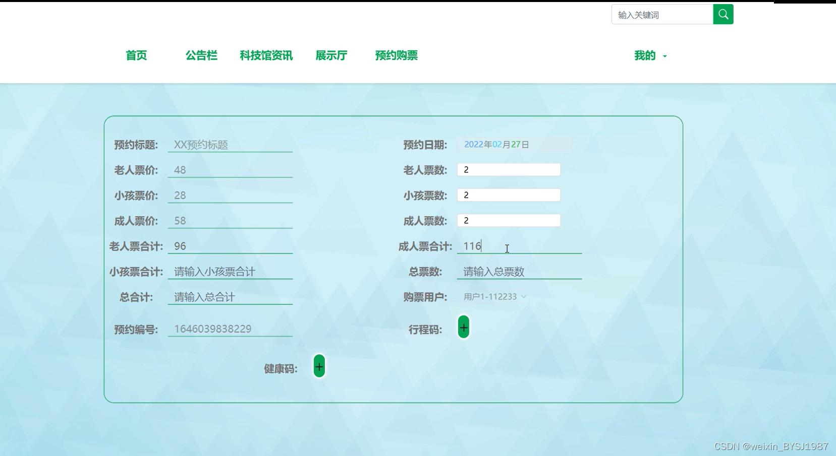 预约购票,在预约购票页面可以查看预约标题、预约日期、老人票价、老人票数、小孩票价、小孩票数、预约编号、健康码、行程码等信息进行提交预约,如图5-11所示。