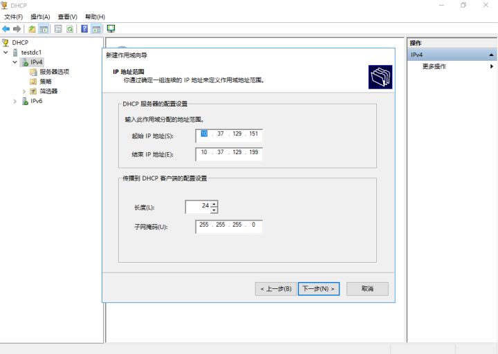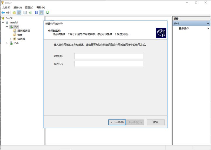 为了让 DHCP 服务器正常运行,首先要定义“作用域”,一个作用域指的是由服务器发布的一段 IP 地址池,以及这段地址池的掩码和一系列其他设置。一台服务器上可以设置多个作用域。从“服务器管理器“中启动 DHCP 控制台,展开当前服务器,右键选择“IPv4”,打开“新建作用域”。