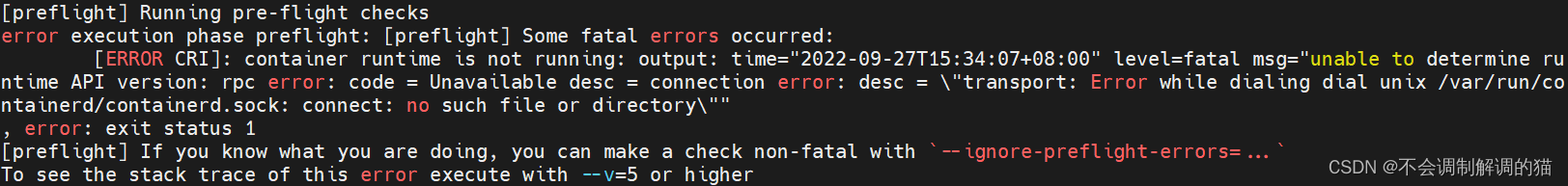 [preflight] Running pre-flight checkserror execution phase preflight: [preflight] Some fatal errors occurred: [ERROR CRI]: container runtime is not running: output: time="2022-09-27T15:34:07+08:00" level=fatal msg="unable to determine runtime API version: rpc error: code = Unavailable desc = connection error: desc = \"transport: Error while dialing dial unix /var/run/containerd/containerd.sock: connect: no such file or directory\"", error: exit status 1[preflight] If you know what you are doing, you can make a check non-fatal with `--ignore-preflight-errors=...`To see the stack trace of this error execute with --v=5 or higher