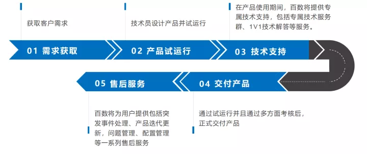 百数完善的服务流程,可以帮助企业在最快的时间内落地,比传统的系统搭建模式更省时省力,在帮助用户进行私有化本地部署的时候,尽可能的节约时间、人力、物力成本。