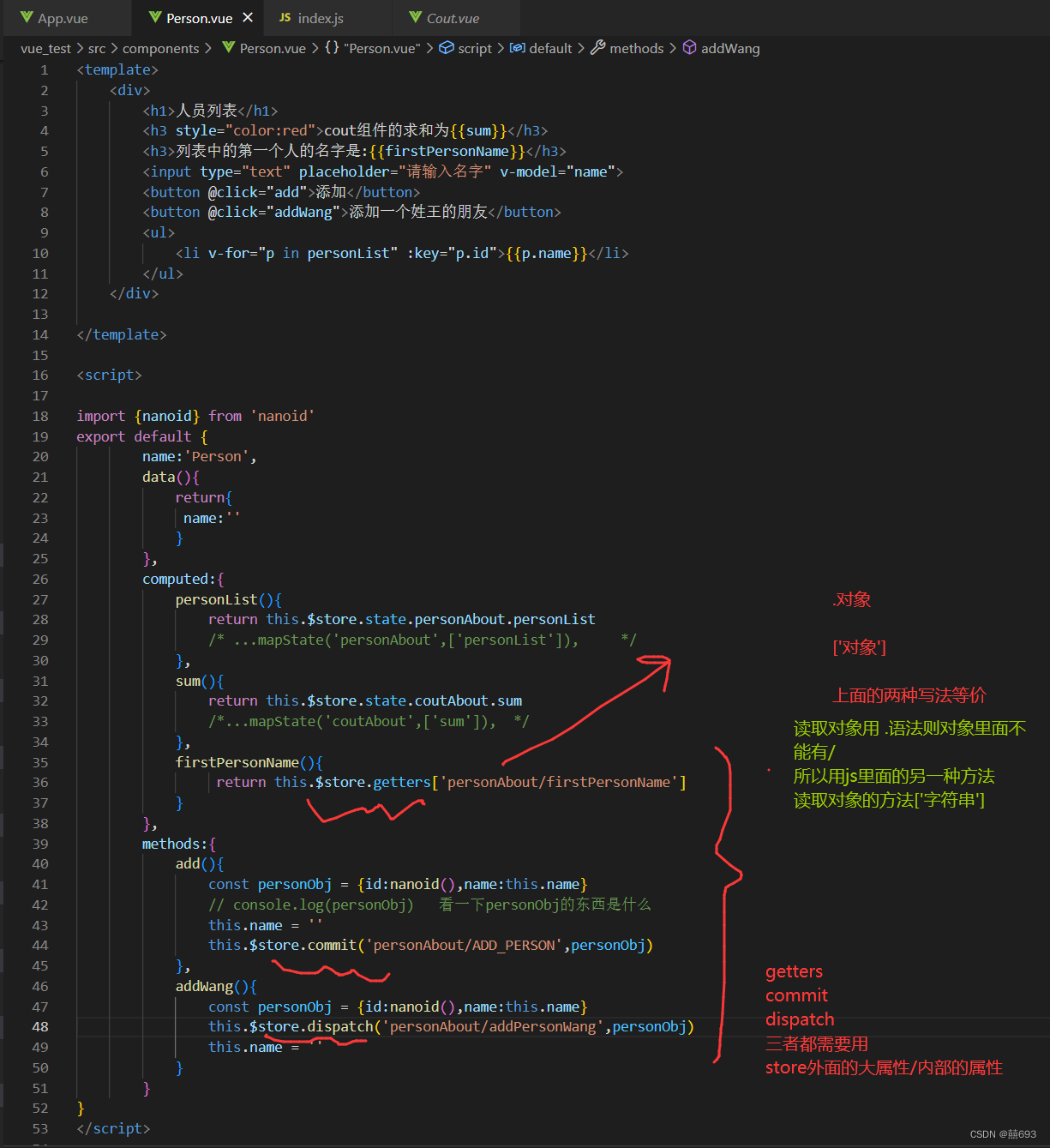 1.修改person组件的内容(完整写法,没有使用mapState,mapMutations、等方法)