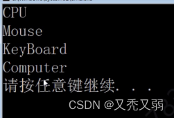 class CPU { public: CPU()//CPU的构造属性 { cout<<"CPU"< } }; class Mouse { public: Mouse()//鼠标的构造属性 { cout<<"Mouse"< } }; class KeyBoard { public: KeyBoard()//屏幕的构造属性 { cout<<"KeyBoard"< } }; class Computer { public: Computer()//电脑的构造属性 { cout<<"Conputer"< } private: CPU cpu; Mouse ms; KeyBoard kb; }; int main() { Computer c; }