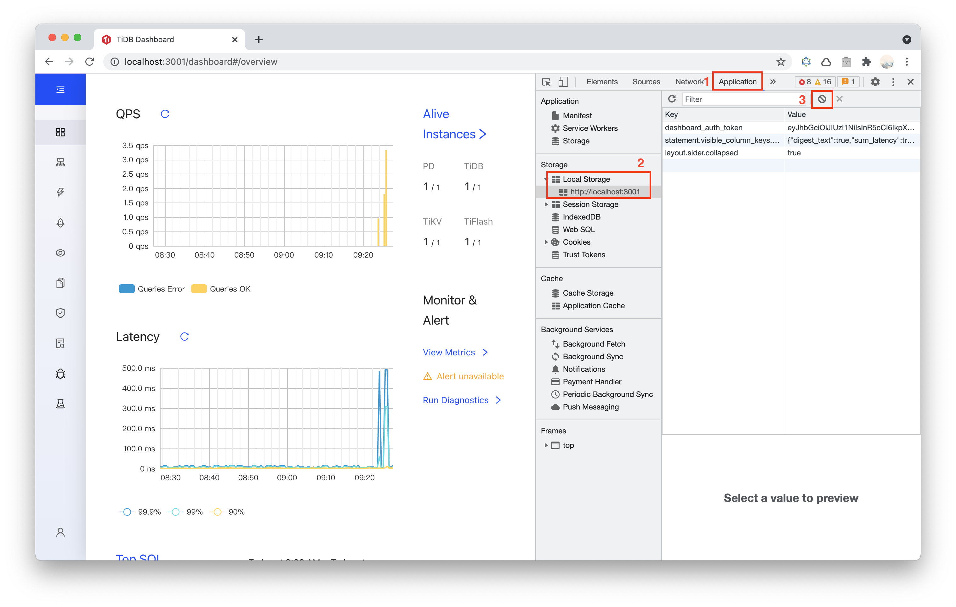 选中 Application 面板,展开 Local Storage 菜单并选中 TiDB Dashboard 页面的域名,点击 Clear All。