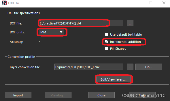 操作步骤为:File-import-dxf,选中待导入的结构图,导入目录不要有中文和非法字符。单位选择mm,勾选incremental addition,表示在当前的PCB下增加板框文件,如果不勾选,则会重新新建一个PCB。cnv是自动生成的,不用管,然后点击edit/view layers进行层面映射。首选选择board geometry层,然后新建一个子层,一般以日期命名,方便回溯结构版本,然后勾选select all,点击map就映射OK了,最后点击import即可导入。