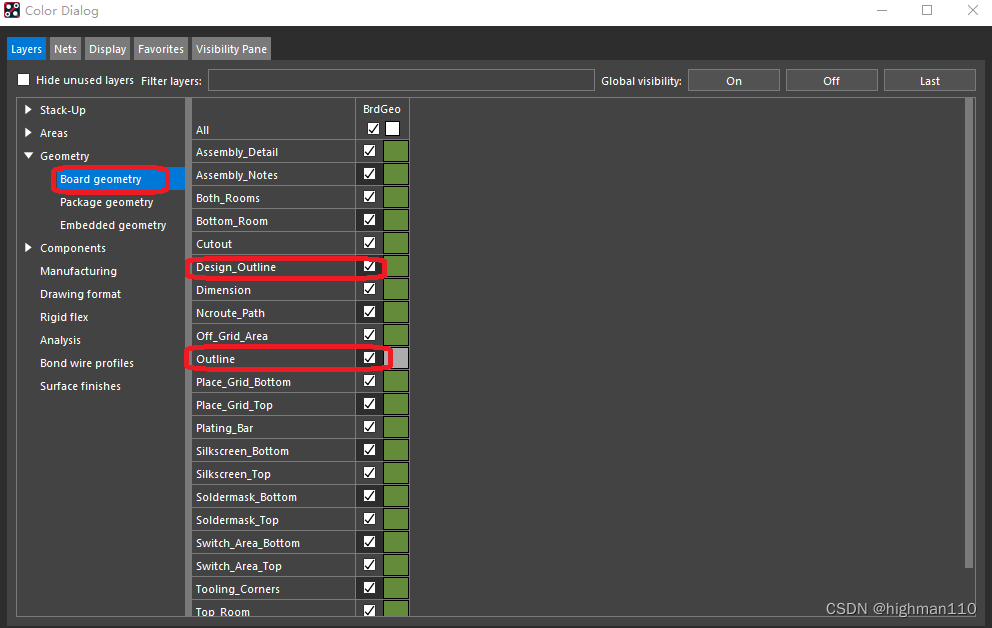 首先要注意allegro的板框所处的层有变化,在17版本之前,板框位于board geometry-outline,在17版本之后,又新增了一个design outline层用来画板框,当然这两个我们都可以用,一般情况下如果我们用的新版本软件,就画在design outline层。打开颜色管理器如下图所示: