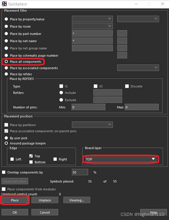 操作步骤为:place-quickplace,选择摆放所有器件,放在top层,点击place即可完成摆放。