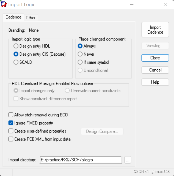 3、导入网表。Import-netlist(有的版本叫logic),出现如下界面,勾选如下的design entry CIS(capture),表示网表是capture这个工具生成的,place changed component中选择always,表示永远更新新器件,勾选ignore fixed properties,表示忽略掉固定属性,如果某网络在PCB中设置了fix属性,但是网表更新后这个网络有变化,这时导新网表会出错,所以勾选忽略固定属性,一切修改以网表的输入为准。然后点击import cadence。导入后注意观察是否有error需要解决。注意如果封装库里的封装是用高版本软件制作的,此时导入网表也会提示封装找不到的告警。